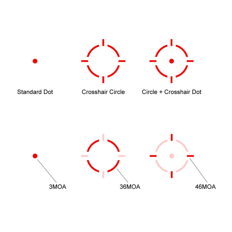 - Veľkosť bodu / osnova: 3 MOA bod, kruh, kríž (multi-reticle)